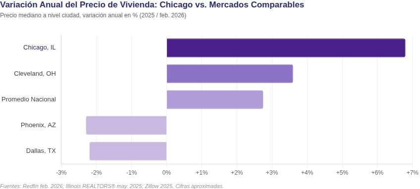 El mercado inmobiliario residencial de Chicago ha entrado en un período de rendimiento superior sostenido con respecto a los puntos de referencia nacionales y a muchos de sus mercados comparables más citados. El precio mediano de venta de viviendas en la ciudad alcanzó US$390.000 en febrero de 2026, lo que representa un crecimiento interanual del 6,8% — más del doble del promedio nacional de aproximadamente el 2,75%, y más sólido que Miami, Dallas y Phoenix, todos los cuales registraron caídas de precios interanuales en 2025. La mediana más amplia del área metropolitana de Chicago alcanzó US$379.900 en mayo de 2025, un aumento del 5,5% respecto al año anterior. Los precios de las viviendas unifamiliares en la ciudad crecieron aproximadamente un 13% durante el año completo de 2025, reflejando la escasez aguda de viviendas bien mantenidas en barrios establecidos. Illinois REALTORS® proyecta un aumento adicional del 5% en la mediana metropolitana para 2026.