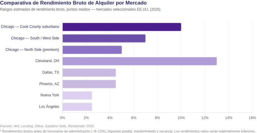 Los rendimientos brutos de alquiler varían significativamente en toda el área metropolitana. Los barrios premium del North Side, como Lincoln Park y Wicker Park, ofrecen rendimientos del 4–6%, reflejando precios de entrada que ya han incorporado plenamente las expectativas de revalorización. La mayor oportunidad para los inversores orientados a los ingresos se encuentra en los submercados emergentes del South Side y West Side y en el Cook County suburbano de primer anillo, donde se pueden obtener rendimientos brutos del 6–8% en submercados establecidos y del 8–12% o más en ubicaciones de mayor rendimiento como Calumet City y Chicago Heights, con precios de entrada que típicamente oscilan entre US$150.000 y US$350.000. Estos niveles de rendimiento superan sustancialmente las cifras comparables en los mercados de entrada costeros.
