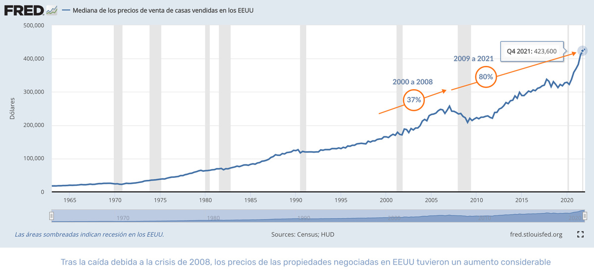 Los precios de la vivienda en los EE. UU. siguen subiendo. Empujados por una cantidad limitada de viviendas y una intensa competencia, los precios de las viviendas en los EE. UU han aumentado constantemente año tras año desde 2012, independientemente del estado de la economía. Además, a diferencia de la mayoría de los sectores, que vieron una desaceleración significativa en sus actividades, el mercado inmobiliario de los EE. UU. ha desafiado todas las expectativas, llegando a niveles récord tras la pandemia.
