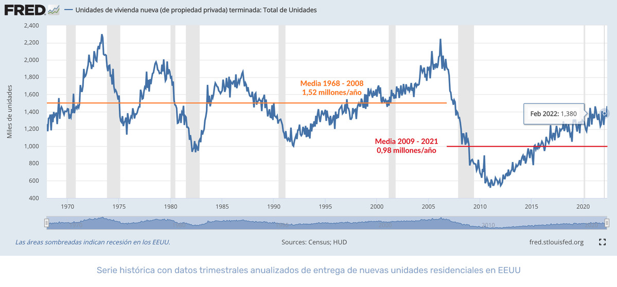 Esto no siempre ha sido así. En diferentes etapas de la historia de los EE. UU., se produjeron expansiones y contracciones en la oferta de viviendas. En los años previos al desplome de las hipotecas de alto riesgo que tuvo lugar en 2008, el promedio de construcción anual de nuevas viviendas fue de alrededor de 1,52 millones, algo que de alguna manera intentó paliar la demanda. Pero cuando el mercado inmobiliario colapsó, muchas empresas de construcción quebraron, lo que provocó una fuerte caída en la producción de viviendas asequibles.